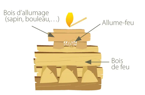 Disposez vos bûches et des petits tronçons de bois selon le schéma ci après. Positionnez un allume-feu entre les tronçons de bois sur le dessus et allumez-le. Fermez la porte de votre appareil en veillant à ce que les entrées d’air soient ouvertes au maximum.