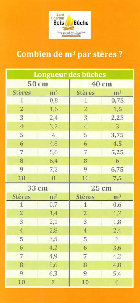 Voici un petit tableau officiel qui vous permettra d’y voir plus clair dans les équivalences stère / mètre cube en fonction de la longueur des bûches.